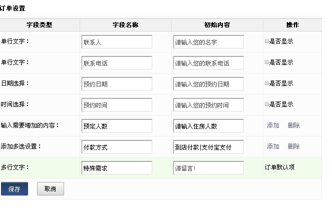 为订单设置需要显示的信息,比如在订单列表中显示状态、预定人电话等等信息,你想让客户填写那些订单信息都可以在这里设置显示。