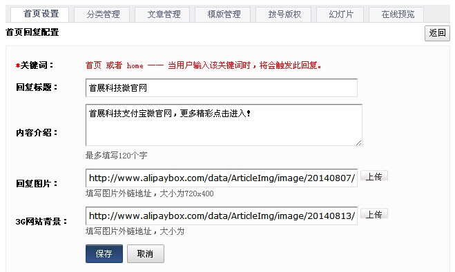 设置云官网的关键字、首页背景图片及顾客输入关键字后回复的内容。