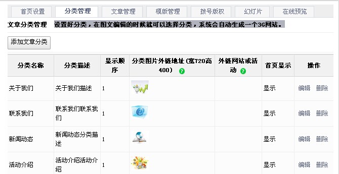 设置好分类,在图文编辑的时候就可以选择分类,系统会自动生成一个3G网站。