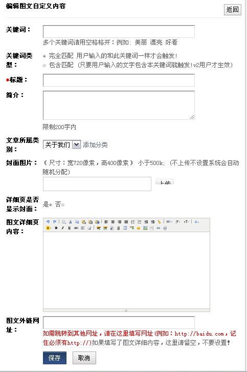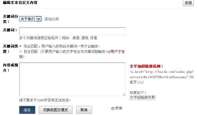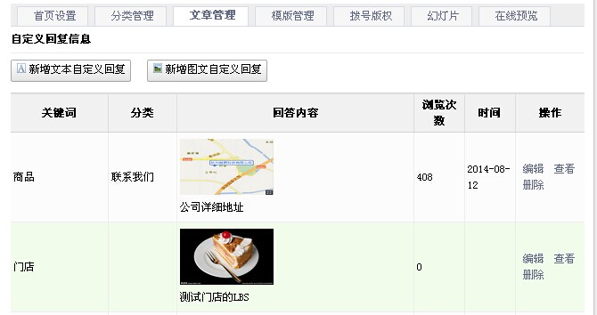 用于管理我们添加的图文和文本素材,操作有编辑、删除和查看。可以新增文本自定义回复,新增图文自定义回复。