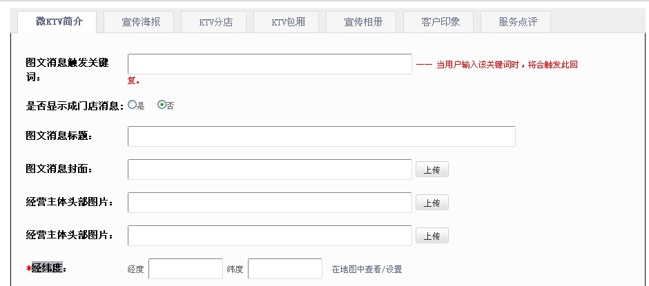 (1) 设置KTV图文消息触发关键词、图文信息、经营主体头部图片、经纬度等基本信息