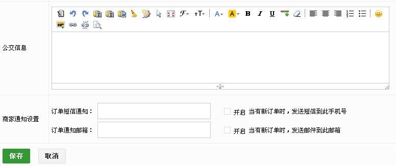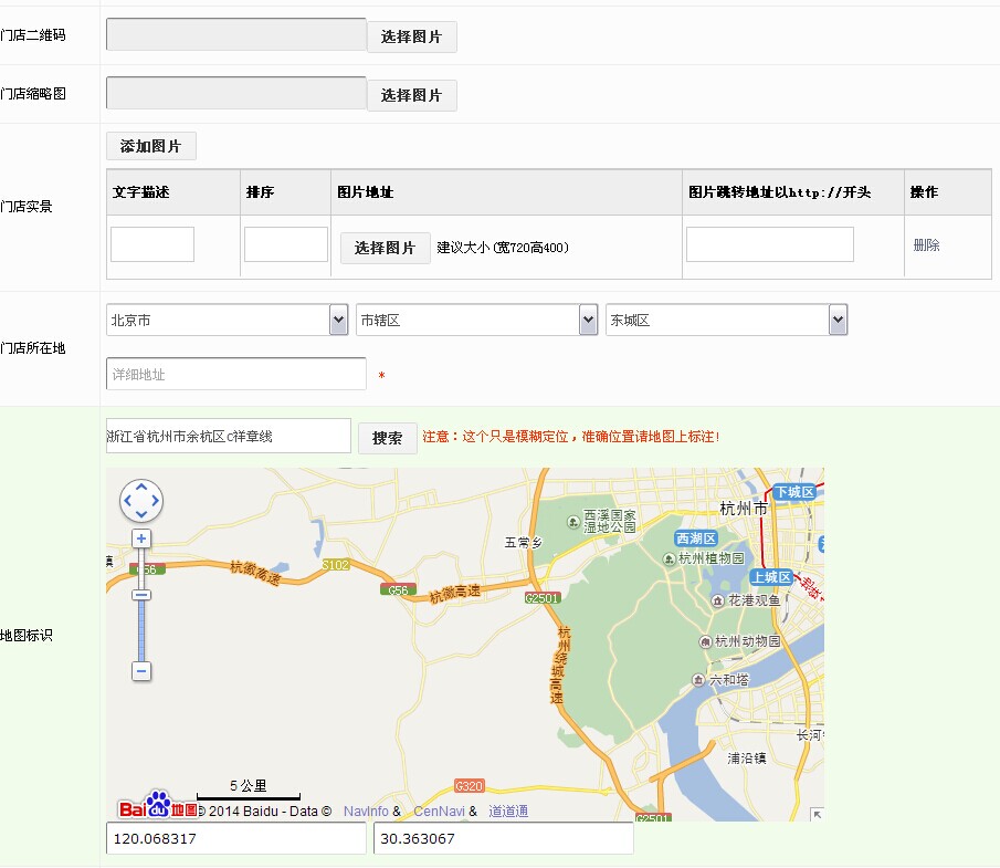 13.4 上传门店二维码、门店略缩图、门店实景,填写门店所在地,标识门店地址,填写公交方案,设置商家通知短信及邮箱。